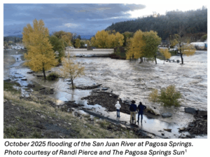 This rapid assessment is provided to serve as a scientific resource for the extreme flooding events that impacted the southwestern Colorado region from October 10th-14th, 2025. Flood impacts were felt across southwestern Colorado, especially in Pagosa Springs along the San Juan River and in La Plata County along Vallecito Creek. These recent flooding events were historic in magnitude (3rd largest flood on record for the Pagosa Springs area, 2nd largest flood on record for Vallecito Creek) and follow over two decades of drought conditions and increasing wildfire activity in the region. Extreme events like this illuminate the growing risk of natural hazards and the need for building resilience across rural mountain communities. This report is particularly focused on the extreme flooding that occurred in the Pagosa Springs area.